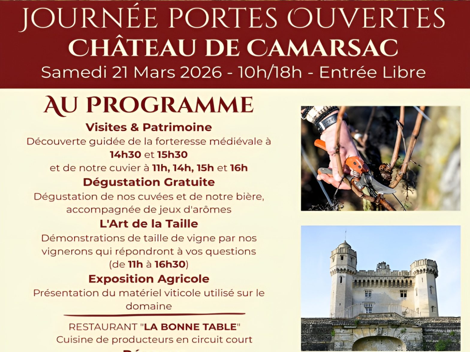 Le Château de Camarsac vous ouvre ses portes le samedi 21 mars pour une journée conviviale dédiée au patrimoine et au vin. Profitez de visites guidées de la forteresse médiévale à 14 h 30 et 15 h 30, ainsi que du cuvier à 11 h, 14 h, 15 h et 16 h. Tout au long de la journée, une dégustation gratuite de nos cuvées et de notre bière vous est proposée, accompagnée de jeux d’arômes. Assistez également à des démonstrations de taille de vigne par nos vignerons, de 11 h à 16 h 30. Une exposition de matériel viticole complète le programme. Entrée libre. Le restaurant La Bonne table vous accueillera pour le repas du midi (réservations conseillées).