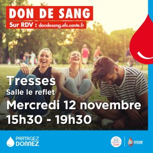 La prochaine collecte de don de sang se déroulera à Tresses le mercredi 12 novembre de 15h30 à 19h30 à la salle Le Reflet.